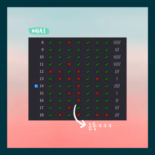 📌 사용하는 해빗트랙커 앱의 스크린샷이나, 다이어리에 체크하고 사진 찍어 올리셔도 돼요. 마음에 드는 앱이 없다면 저처럼 직접 만들어 쓰셔도 됩니다(저는 노트테이킹 프로그램 Obsidian 이용하고 있어요).