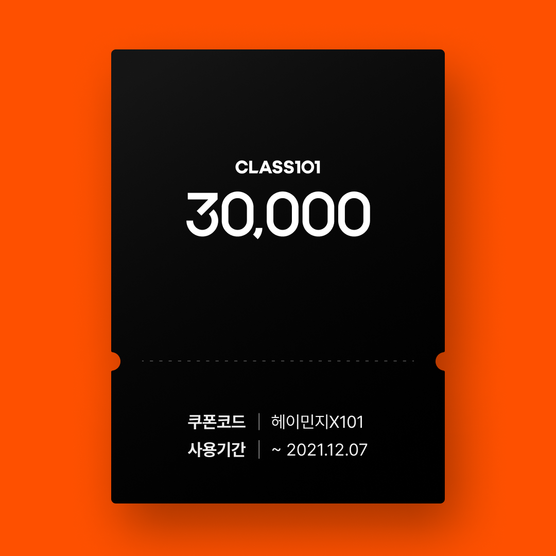 💌 쿠폰 코드: 헤이민지X101 - 2021. 12. 07 11:59까지만 사용 가능한 타임세일 쿠폰입니다. (즉시 사용 가능, 발급 후 7일간 사용 가능, 헤이민지 클래스에만 사용 가능) - 이벤트 기간 만료 후 해당 쿠폰 재사용은 불가합니다. - 본 쿠폰은 다른 쿠폰과 중복 사용이 불가합니다. - 쿠폰 발급 방법